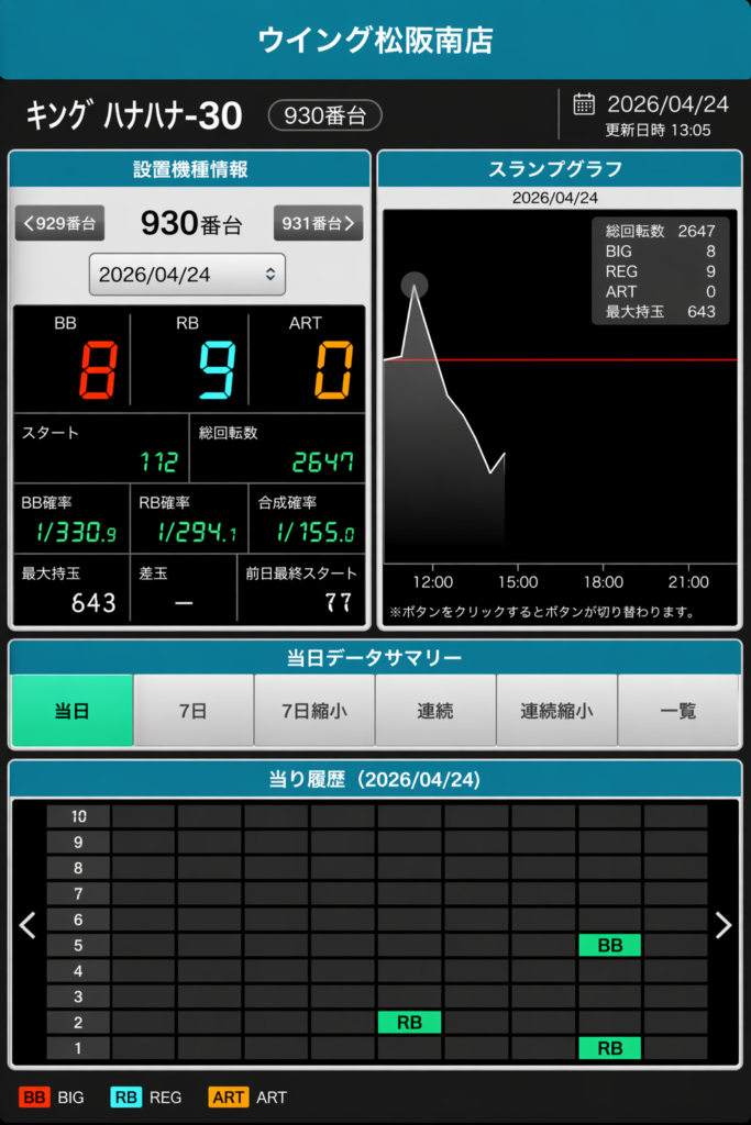 BB・RB回数、総回転数、合成確率、グラフの動きなどを見ながら立ち回れるので、イベント時の後ヅモ狙いにも使いやすいです。